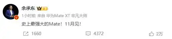 解决方案BU董事长余承东在微博发文表示,“史上最强大的Mate!11月见!”