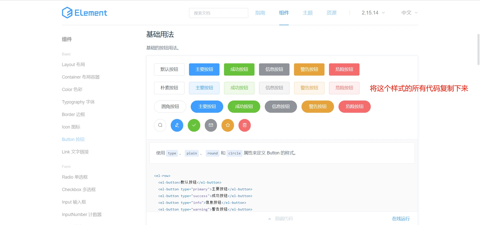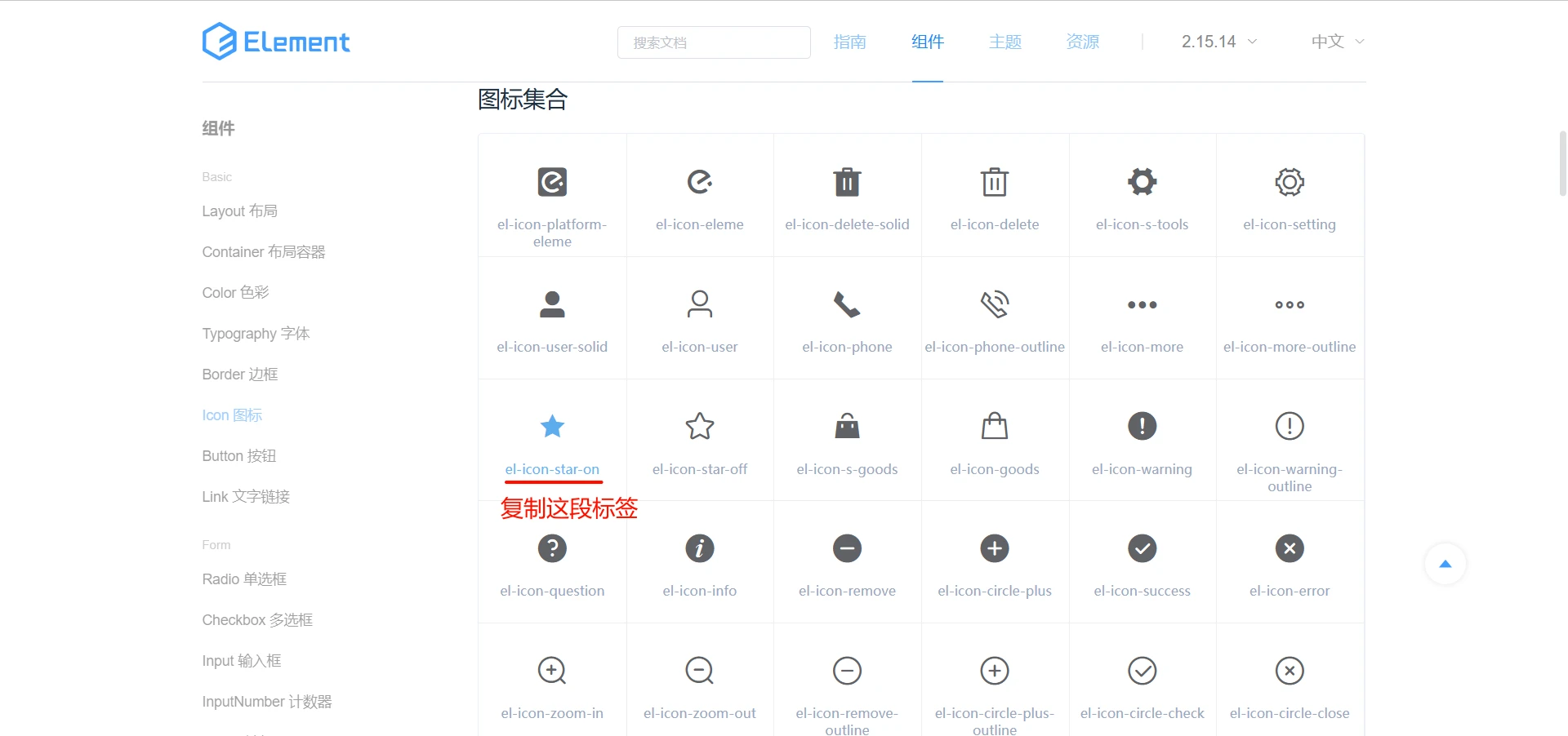那我们还可以更换简洁按钮的图标 , 打开 ElementUI 的图标库 : https://element.eleme.cn/#/zh-CN/component/icon
