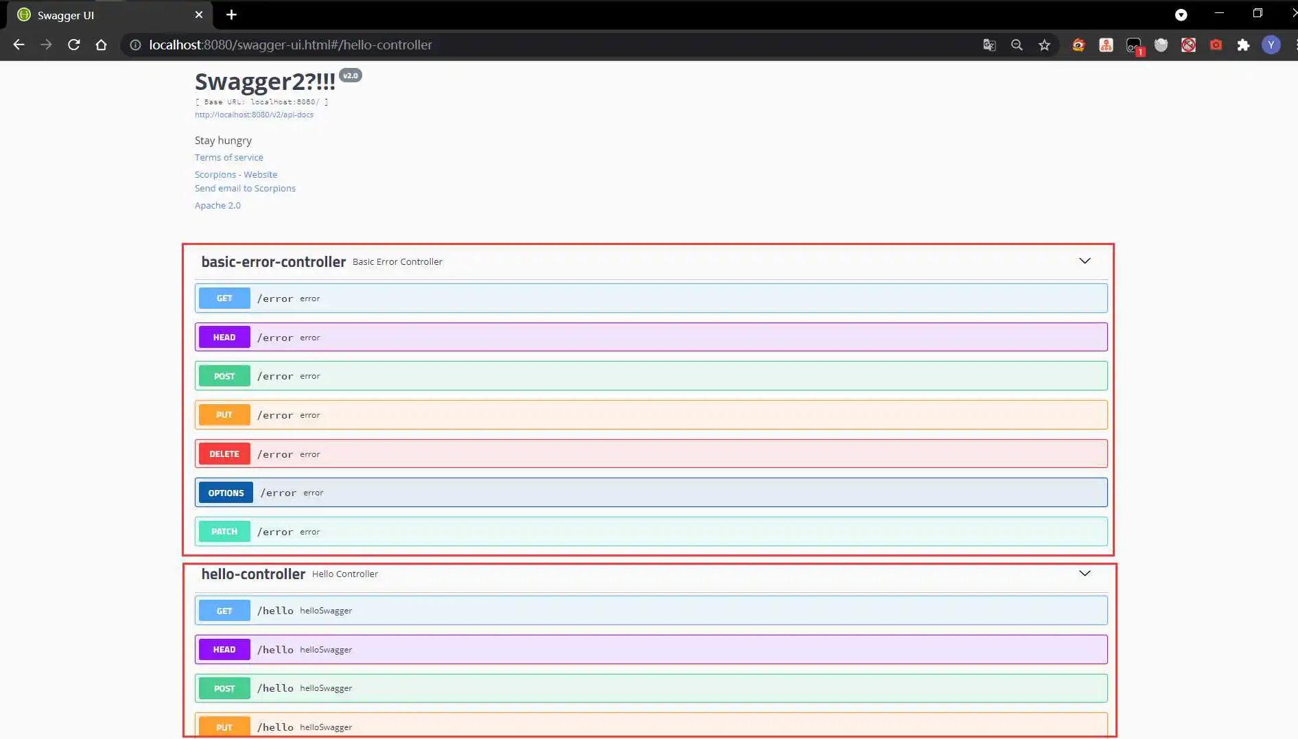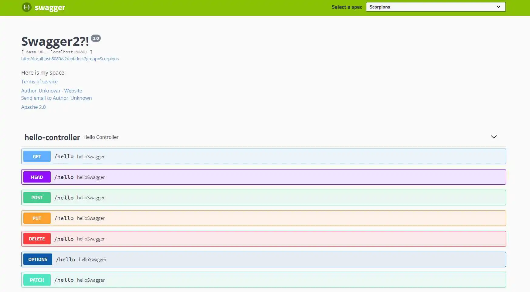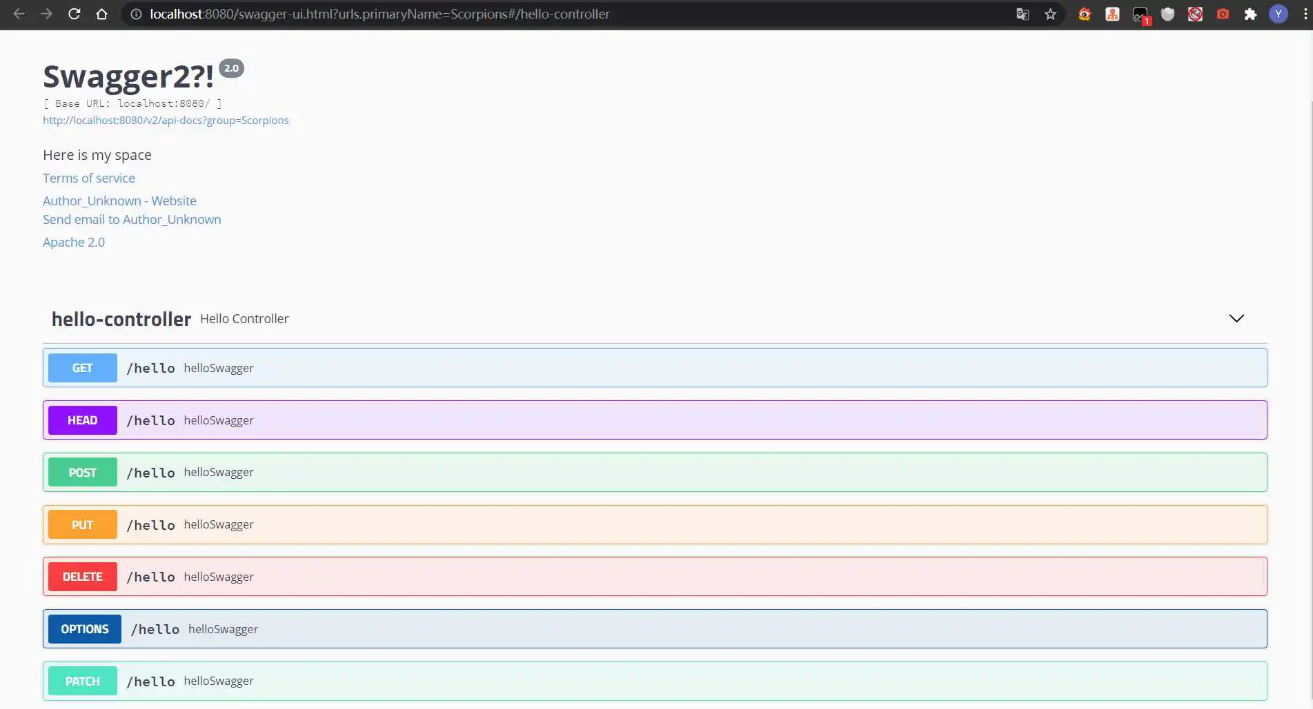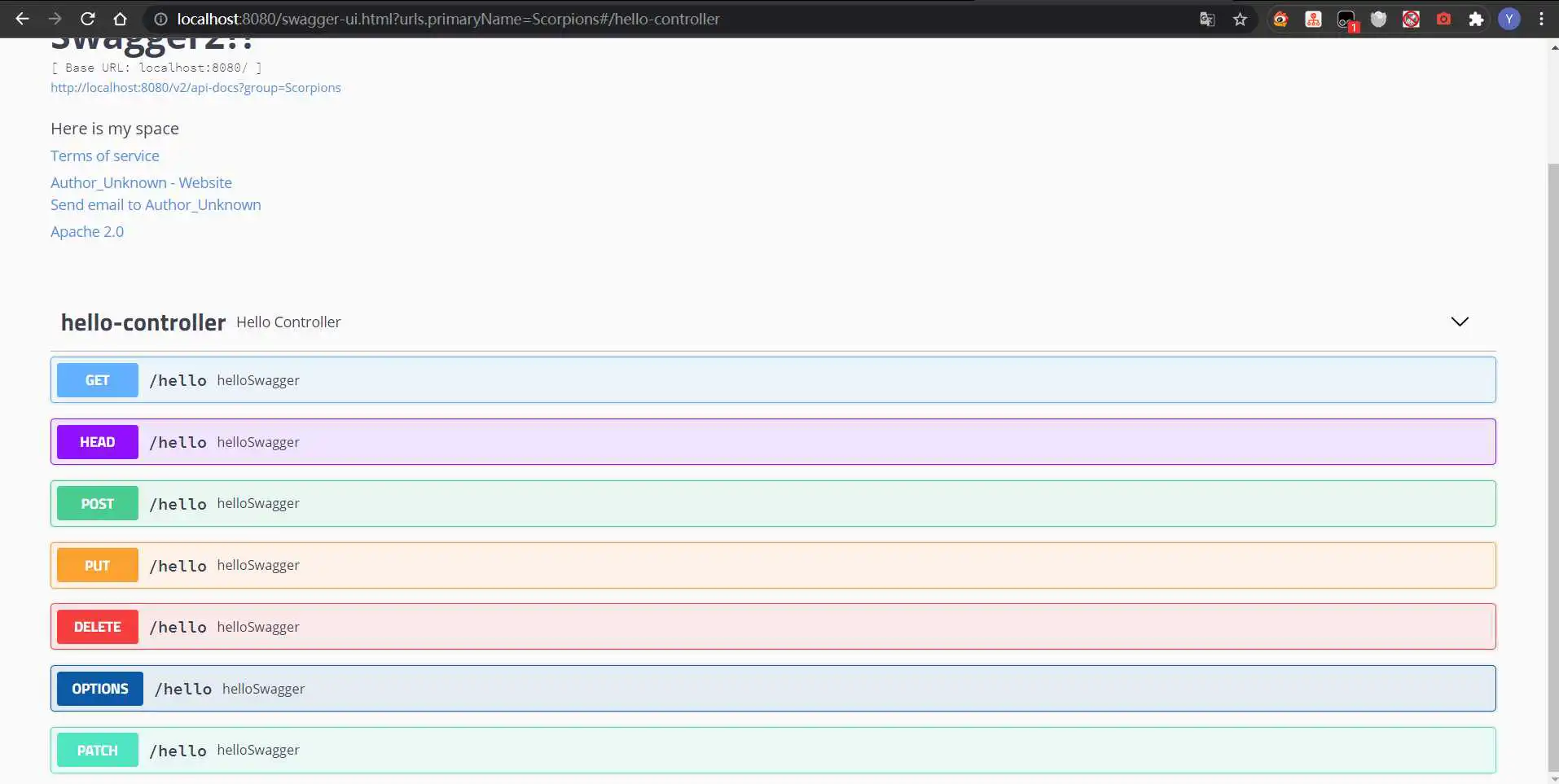 由于 未指定提交方式 :所以 Swagger 文档中就会罗列出所有的 method 供选择,如: GET、HEAD、POST、PUT、DELETE、OPTIONS、PATCH