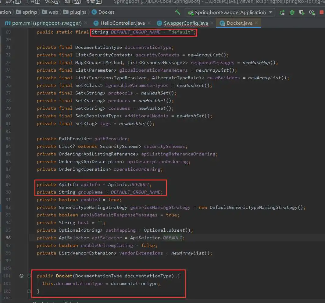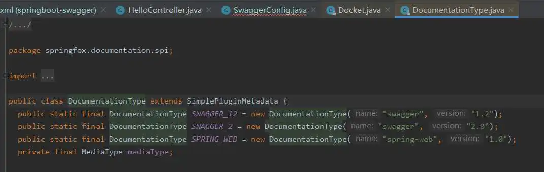 这里我们点进 Docket 源码中查看,发现大部分属性已有默认值,仅有一个构造函数且需要传入 DocumentationType 实例: