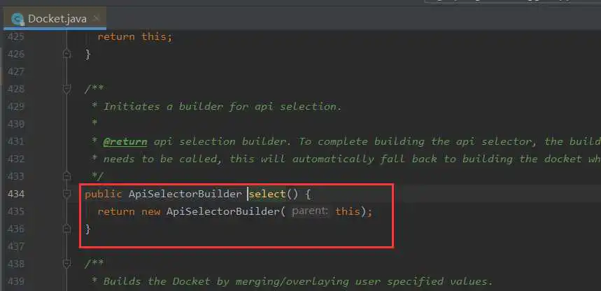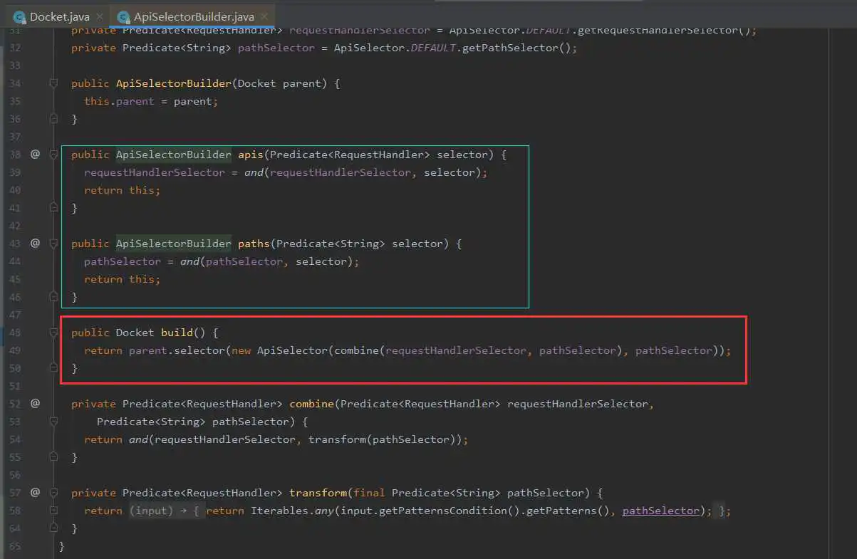 ApiSelectorBuilder 中的 返回 Docket 对象,而 与 都返回 ApiSelectorBuilder 对象,可用于链式调用:
