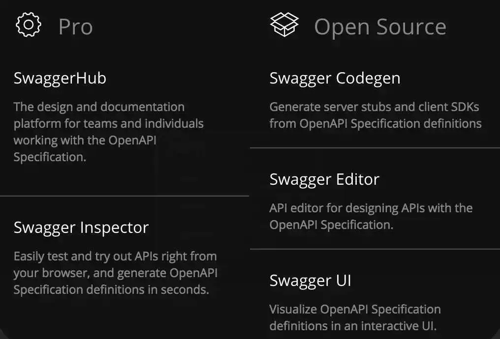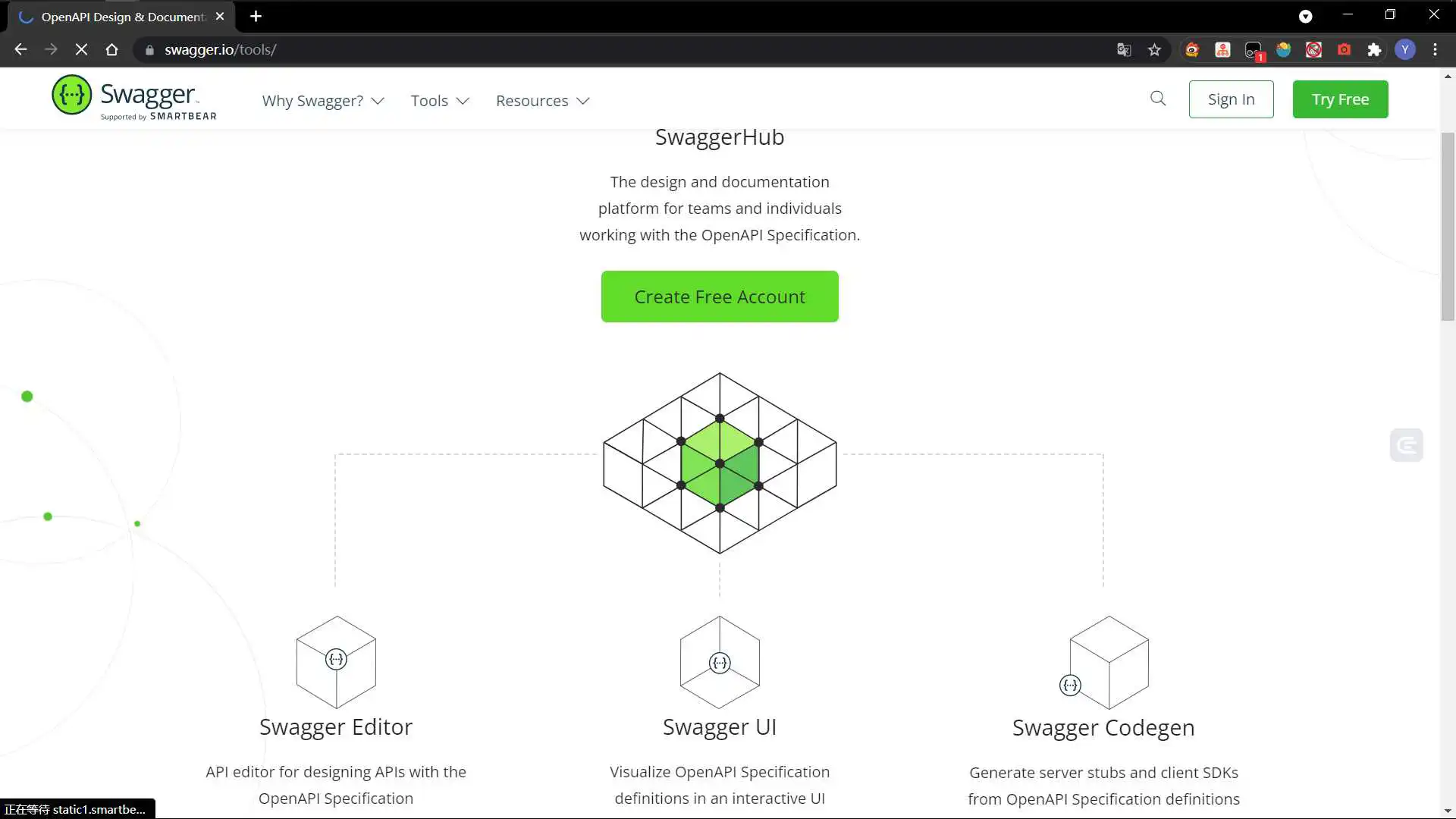 Swagger Hub:集成了上面所有项目的各个功能,你可以以项目和版本为单位,将你的描述文件上传到Swagger Hub中。在 Swagger Hub 中可以完成上面项目的所有工作,需要注册账号,分免费版和收费版。