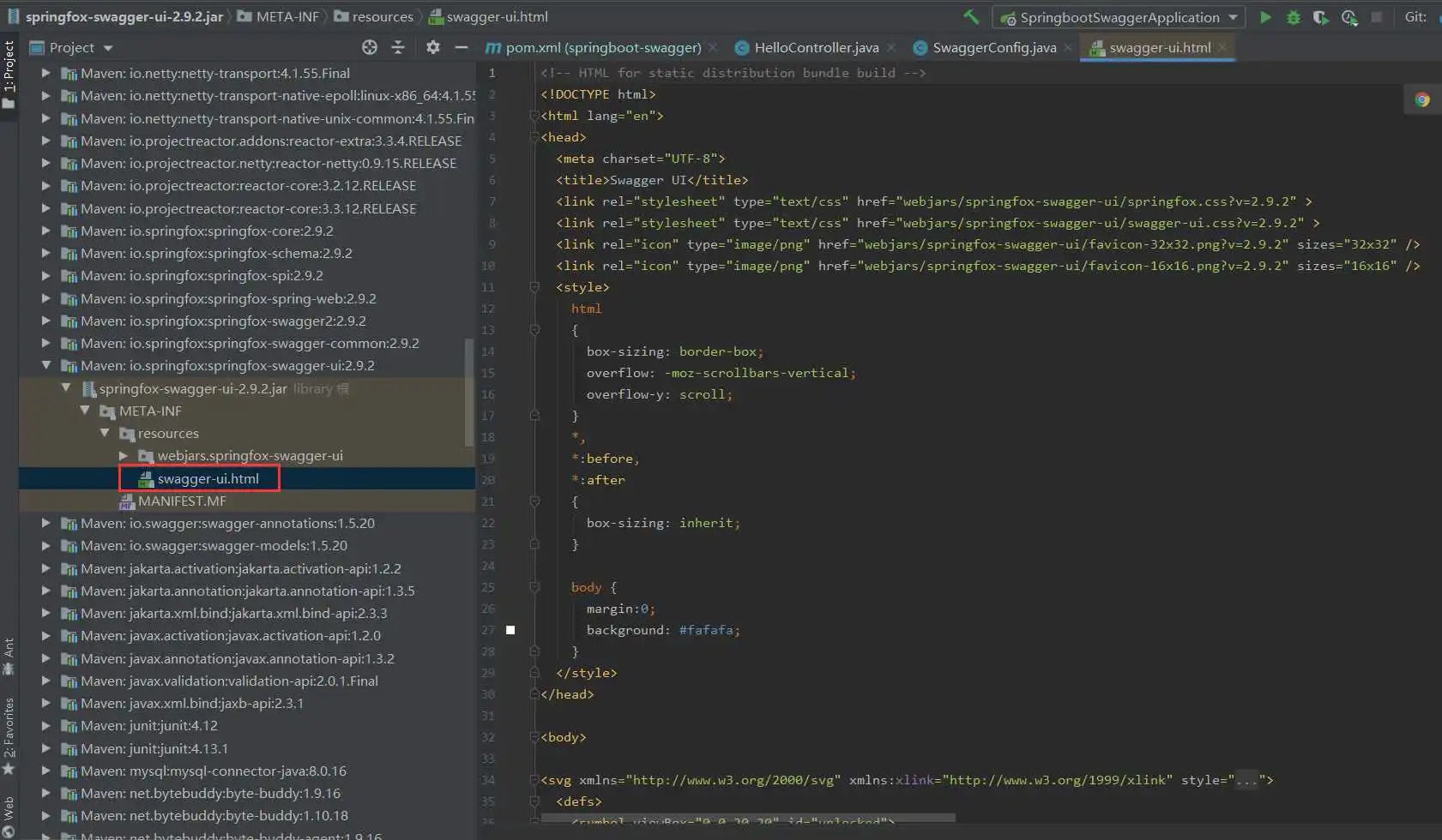 该 swagger-ui.html 界面是 Swagger 为我们提供的 UI 界面,可在引入的依赖中找到: