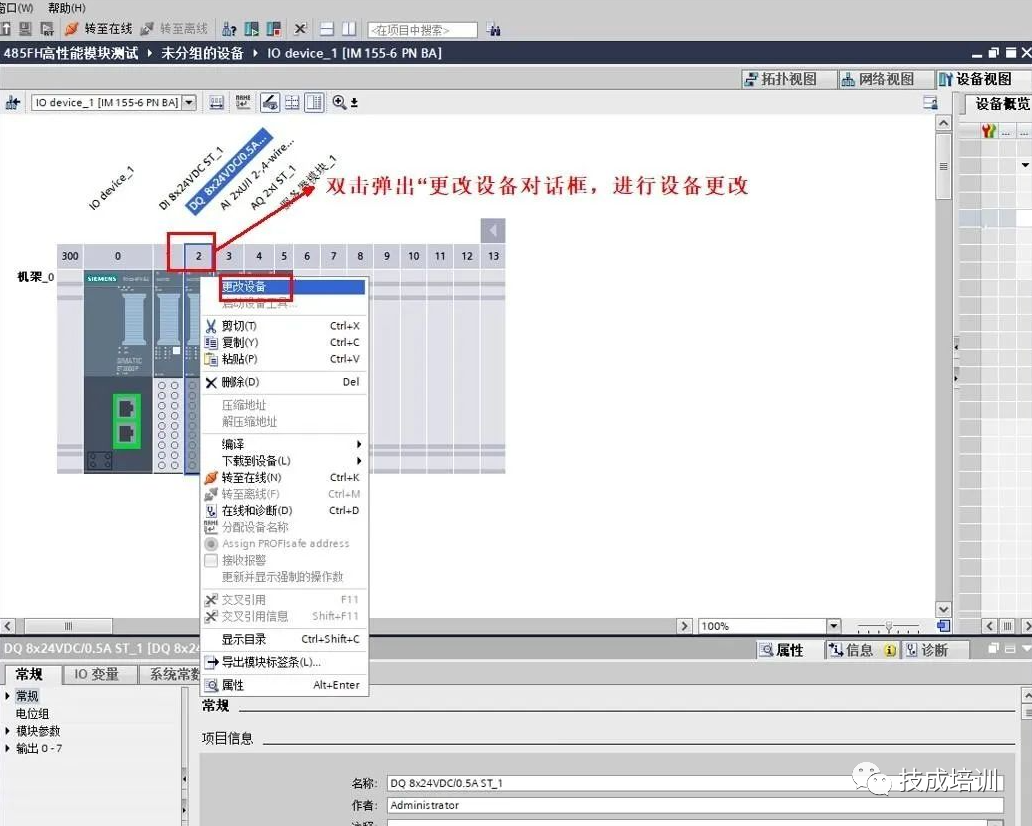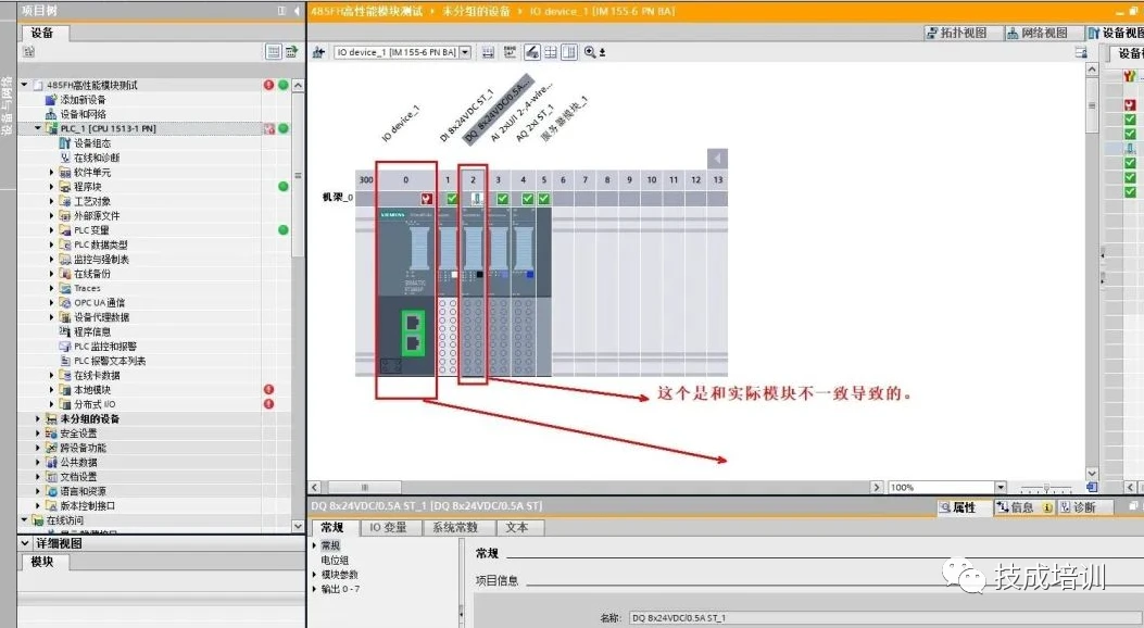 这时候导轨2位的输出模块报错,我们需要检查原因,查到是模块名称和订货号和实际的对不上。那我们把软件切换到离线并替换掉2位数字量输出模块;