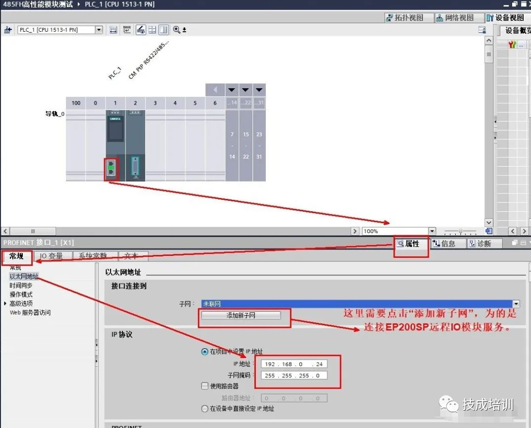 添加方法:单击CPU网口,弹出下拉菜单,找到“属性”,在到“常规”栏目里面的“以太网地址”。弹出一个“添加新子网”的对话框进行设置。