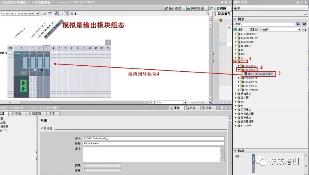 添加方法:找到软件右边“硬件目录”,“AQ”(数字量输入模块,后找到模块型号AQ 2Xi ST图标下拉弹出模块订货6ES7135-6GB00-0AB1的图标,并把它拖拽到软件右上方导轨中4号位即可。