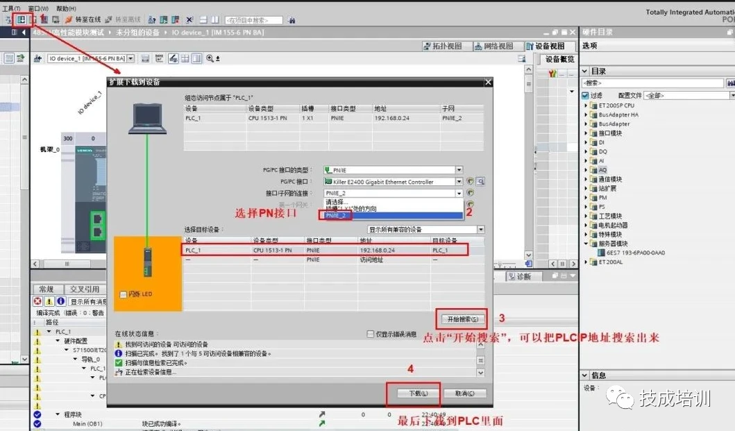 下载方法:点击软件左上方一个绿色快捷下载键弹出“扩展下载到设备”的对话框,PN/PG接口类型选“PN/IE”,PC/PG选软件电脑的实际网卡(这里不要选错,要不然下载不进去),第一个网关选“PN/IE_2”,以上这些设置完成后点击“开始搜索”后得到您所需要下载PLC的地址,最后一步就是下载了。