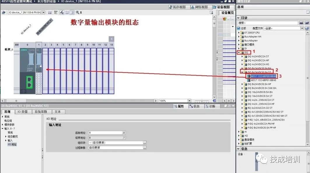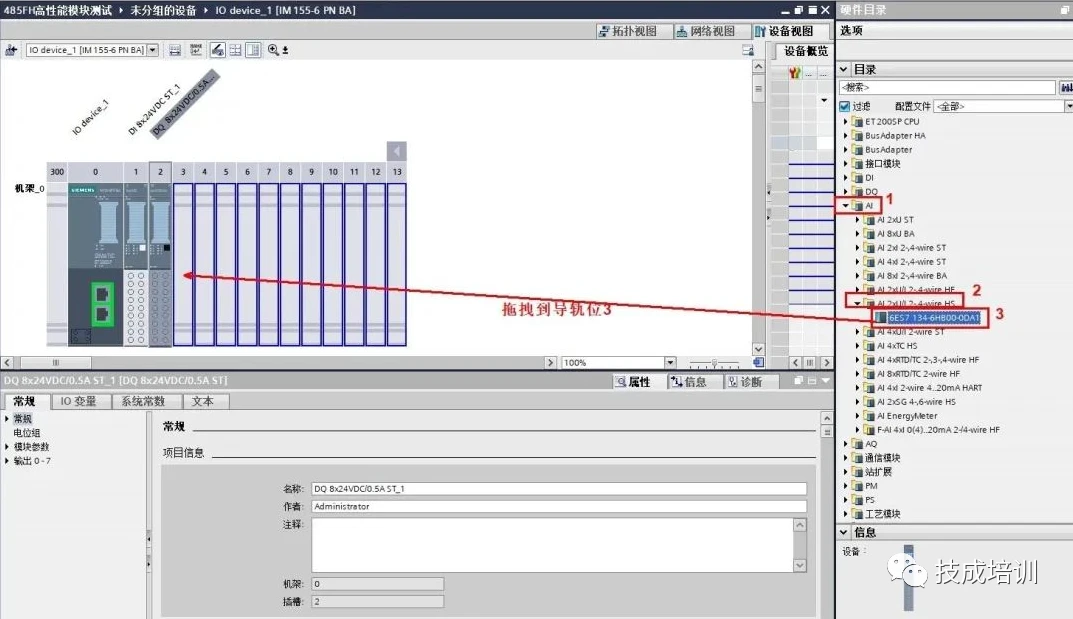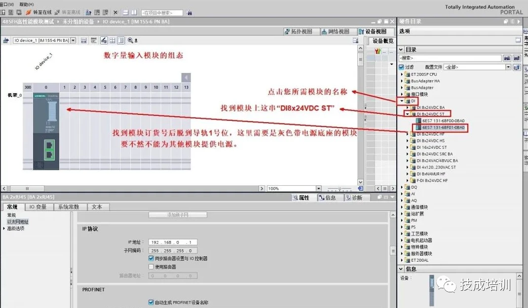 添加方法:找到软件右边“硬件目录”,“DI”(数字量输入模块,后找到模块型号8x24VDC ST图标下拉弹出模块订货号6ES7155-6AR00-0AN0的图标,并把它拖拽到软件右上方导轨中1号位即可。