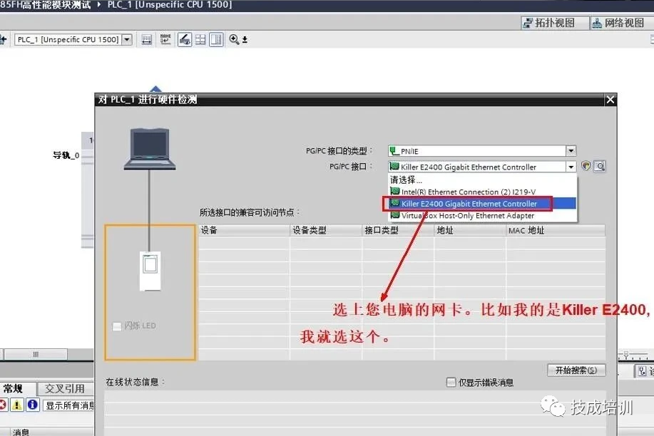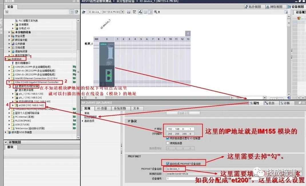 设置方法:在不知道实际IM155-6PN BA接口模块IP地址时,我们可以在左手“项目树”里面找到“在线访问”,单击“Killer E2400”这个对话(也就是我电脑的网卡),得到“更新可访问设备”,它就能搜索出所有在线设备的IP地址,然后就可以把知道的IM155-6PN BA接口模块IP设置到右边对话框 “IP协议”框里(192.168.0.140)。
