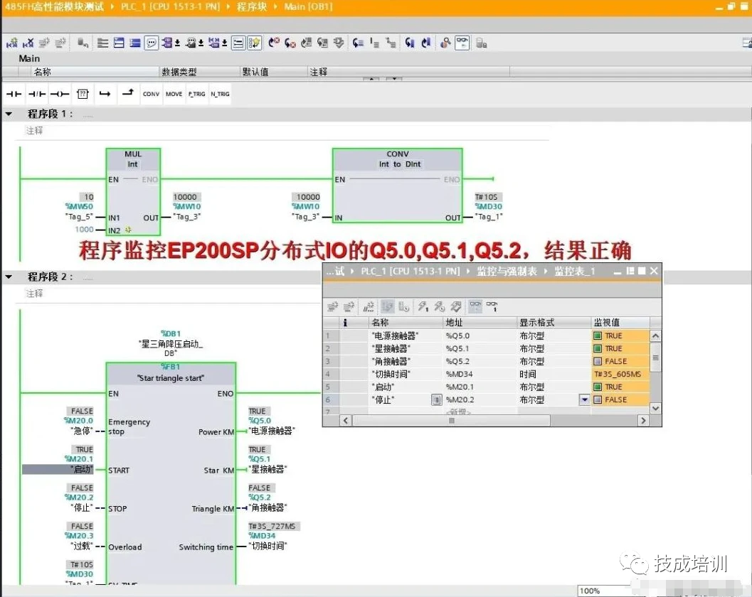这个模块输出点是%Q5.0-Q6.7,总共16个位输出。OB1调用并监控: