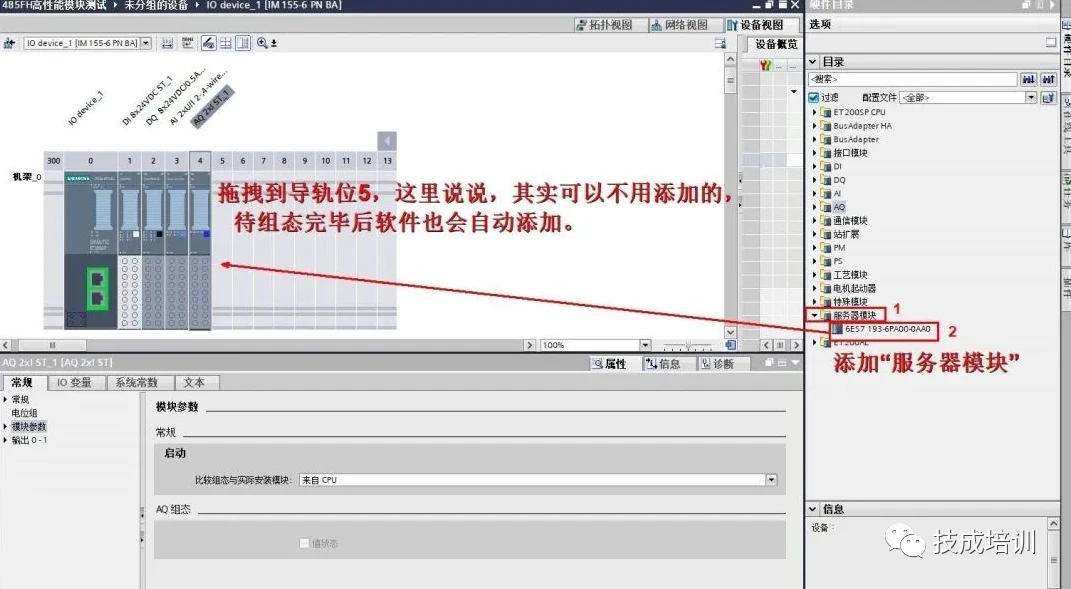 添加方法:找到软件右边“硬件目录”,“后找到服务器模块图标下拉弹出模块订货6ES7193-6PA00-0AA0的图标,并把它拖拽到软件右上方导轨中5号位即可。(其实这一步可以免去不用做的,软件也会自动添加的,我觉得有必要讲一下,万一软件不会自动添加,得手动添加)。