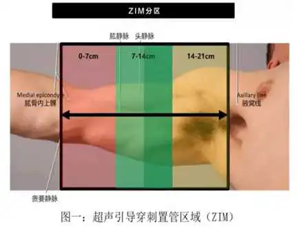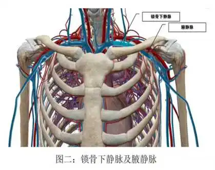 外周静脉置入的中等长度导管又叫中线导管,导管长度20~ 30cm,从肘窝处上下两横指常规穿刺或采用超声引导技术从上臂置入(图一) 贵要静脉、头静脉或肱静脉内,导管尖端位于腋静脉胸段或可到达锁骨下静脉(图二)。