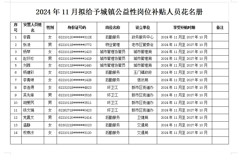 根据甘肃省财政厅、甘肃省人力资源和社会保障厅《甘肃省就业补助资金管理办法》(甘财社【2018】67号)及甘肃省人力资源和社会保障厅、财政厅《关于进一步加强和规范公益性岗位开发管理工作的通知》(甘人社通【2020】126号)规定,市就业服务中心对各用工单位2024年11月上报拟给予城镇公益性岗位补贴的杨琴等12名人员初步审核,符合享受条件,现将相关结果予以公示。公示期间,有关单位、个人及社会各界对所公示的给予补贴人员情况如有异议,请以书面或电话方式向玉门市就业服务中心反映,反映情况须客观真实。以单位名义反映情况的,应加盖单位公章;以个人名义反映情况的,应署真实姓名和联系电话。