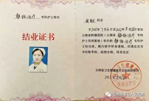 我的努力得到了老师们的认可及好评,并以优异的成绩完成了所有考核,取得了云南省卫健委颁发的静脉治疗专科护士证书。如今新型静疗技术在很多医院得到了广泛开展,培养了很多静疗专科护士,保证了临床输液安全性。而医院及科室给了我这次学习机会让我感到非常自豪!通过此次学习,我受益匪浅,我将利用学到的知识更好的为患者服务,为医院争光!
