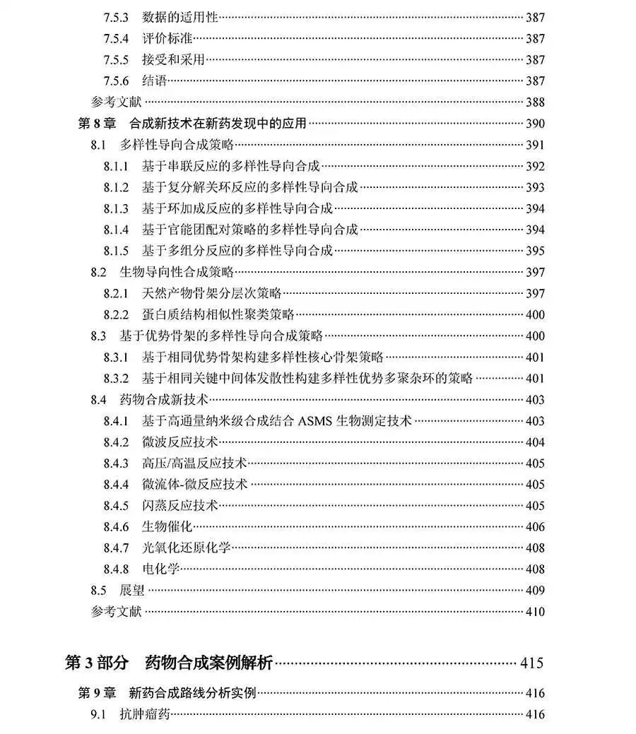 第 3 部分为药物合成案例解析。详细介绍了 70 余个典型药物的合成设计实例,使读者通过这些实例的研读获得药物合 成设计的感性认识与经验。