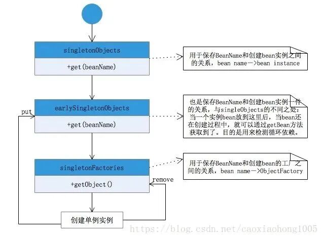 - Spring的依赖注入(包括lazy-init方式)都是发生在AbstractBeanFactory的getBean里。getBean的doGetBean方法调用getSingleton进行bean的创建。