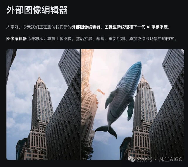 外部图像编辑功能让用户可以上传自己拍摄或制作的图片,利用AI技术对图像进行智能修改。比如,你可以在原有的画面上补充新的元素,或删除不想要的部分,系统会根据你的提示词进行画面补充,生成高质量的新图像。