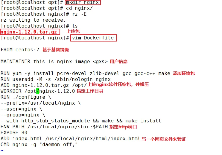 • Dockerfile是一个文本文件,其内包含了一条条的指令(Instruction),每一条指令构建一层, 因此每一条指令的内容,就是描述该层应当如何构建。有了Dockerfile,当我们需要定制自已额外的需求时,只需在Dockerfile.上添加或者修改指令,重新生成image即可,省去了敲命令的麻烦。