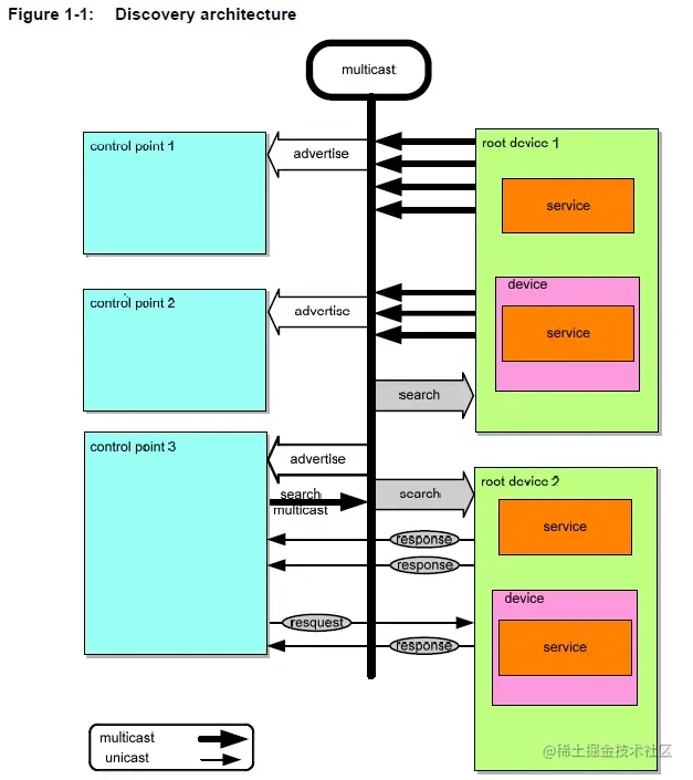 发现是 UPnP工作第一步。 当一个设备被添加到网络后,UPnP的发现协议允许该设备向网络上的Control Points(CPs)通知(advise)自己拥有的服务。同样,当一个CP被添加到网络后,UPnP发现协议允许该CP搜索网络上可用的设备。这两种情况下的组播消息一般是设备和服务的基本信息,如它的类型,唯一标识符,当前状态参数等等。要注意设备信息和服务信息都是要组播出去的。发现的过程可以用下面Figure 1-1来描述。