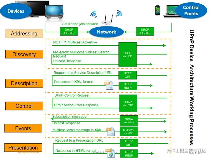 然后是Discovery,采用SSDP协议(UDP),用multicast/unicast可以完成设备的上线和离线通知和组播搜索设备,设备用unicast(单播,UDP)响应CP的搜索。