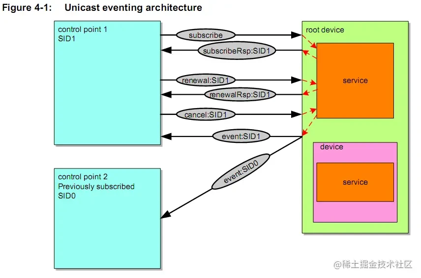 下面是一个Unicast eventing 的architecture图,CP是subscriber,服务器是publisher。