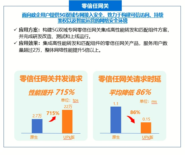 中国移动浙江公司推出的零信任网关,面向政企用户,提供5G双域专网接入安全能力,致力于构建可信访问、持续鉴权以及智能运营的网络安全环境,具备强大的防火墙、监控、流量鉴权和日志审计能力。通过集成高性能转发组件,零信任网关的整体性能显著提升,具体表现在以下几个方面:性能提升7倍,集成高性能转发组件后,零信任网关的处理能力大幅增强,能够支持更高的数据吞吐量,满足大流量网络环境的需求;时延降低80%以上,通过优化数据包处理流程,减少了网络传输过程中的延迟,提升了用户的访问体验;资源利用率更高,由于性能的显著提升,相同条件下所需的硬件资源更少,降低了企业的运维成本,实现了资源的高效利用。(李响/文 中国移动智慧家庭运营中心/供图)