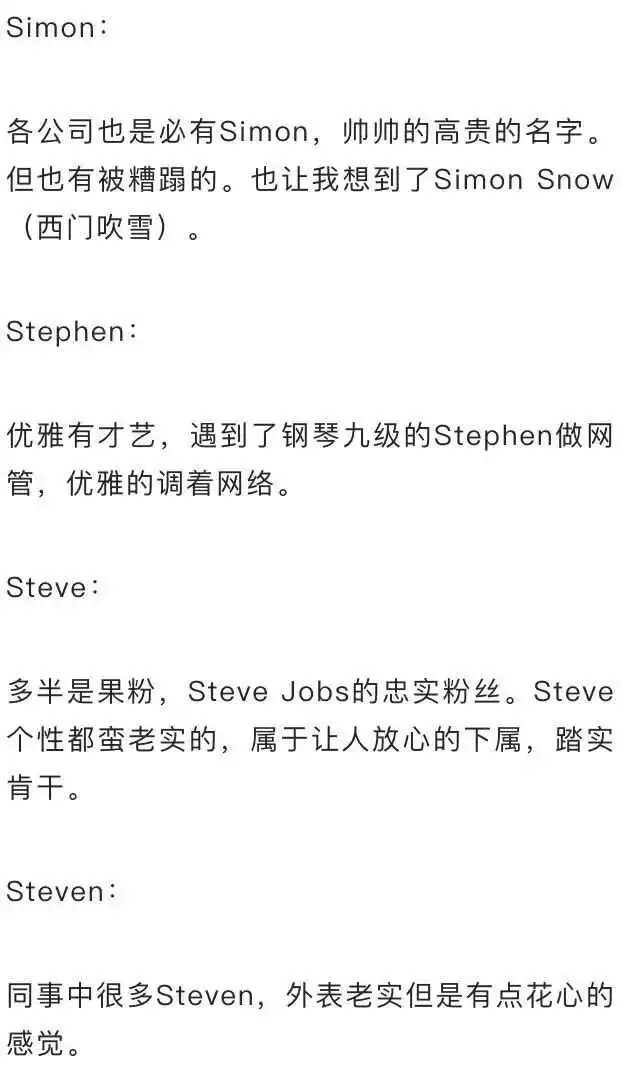 下面,许欢欢老师按字母顺序罗列出外企里最常见的那些英文名,欢迎对号入座。如果你觉得很准确,别来打我;喜欢给人贴标签的朋友慎用哦,会被打的。