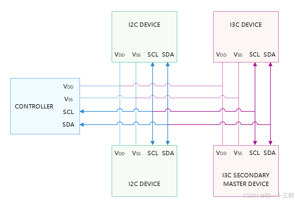 相比于I2C,I3C总线拥有更高的速度、更低的功耗,支持带内中断、从设备热接入以及切换当前主设备,同时向后兼容I2C从设备。一路I3C总线上,可以连接多个设备,这些设备可以是I2C从设备、I3C从设备和I3C次级主设备,但只能同时存在一个主设备,一般为控制器本身。