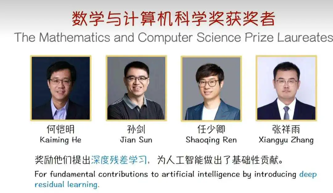 刚刚!2023年未来科学大奖名单公布,计算机视觉领域残差网络的四位作者:何恺明、张祥雨、任少卿、孙剑,共同获得数学与计算机科学奖。