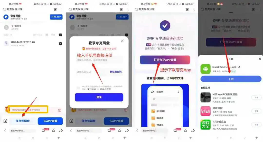 夸克网盘使用步骤指引(下图从右至左看):