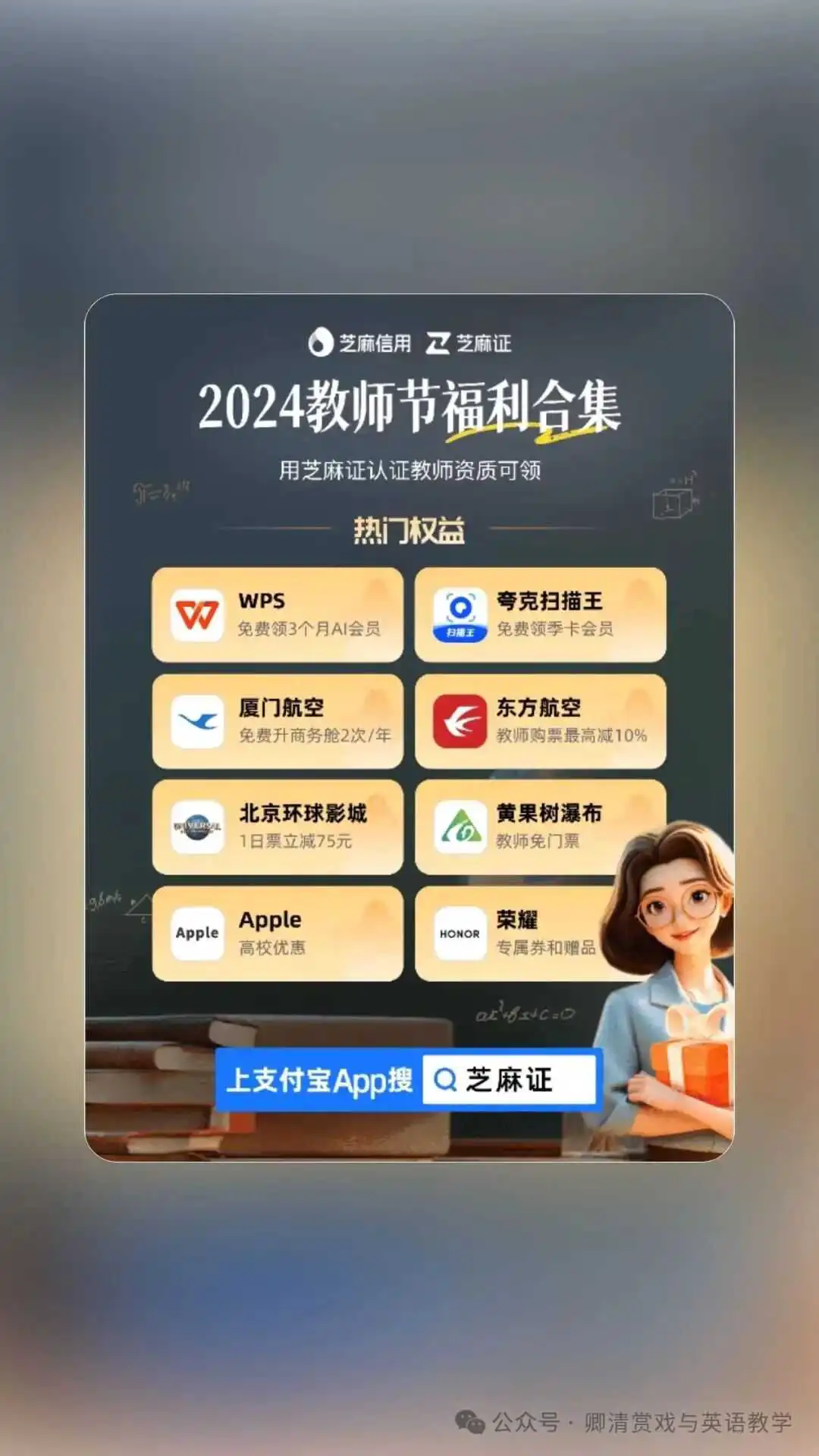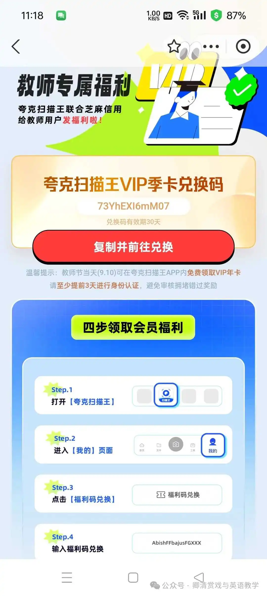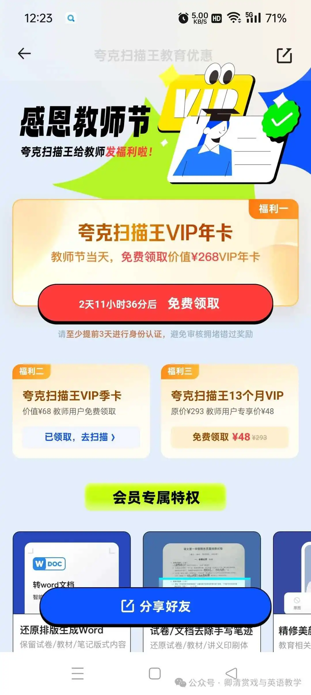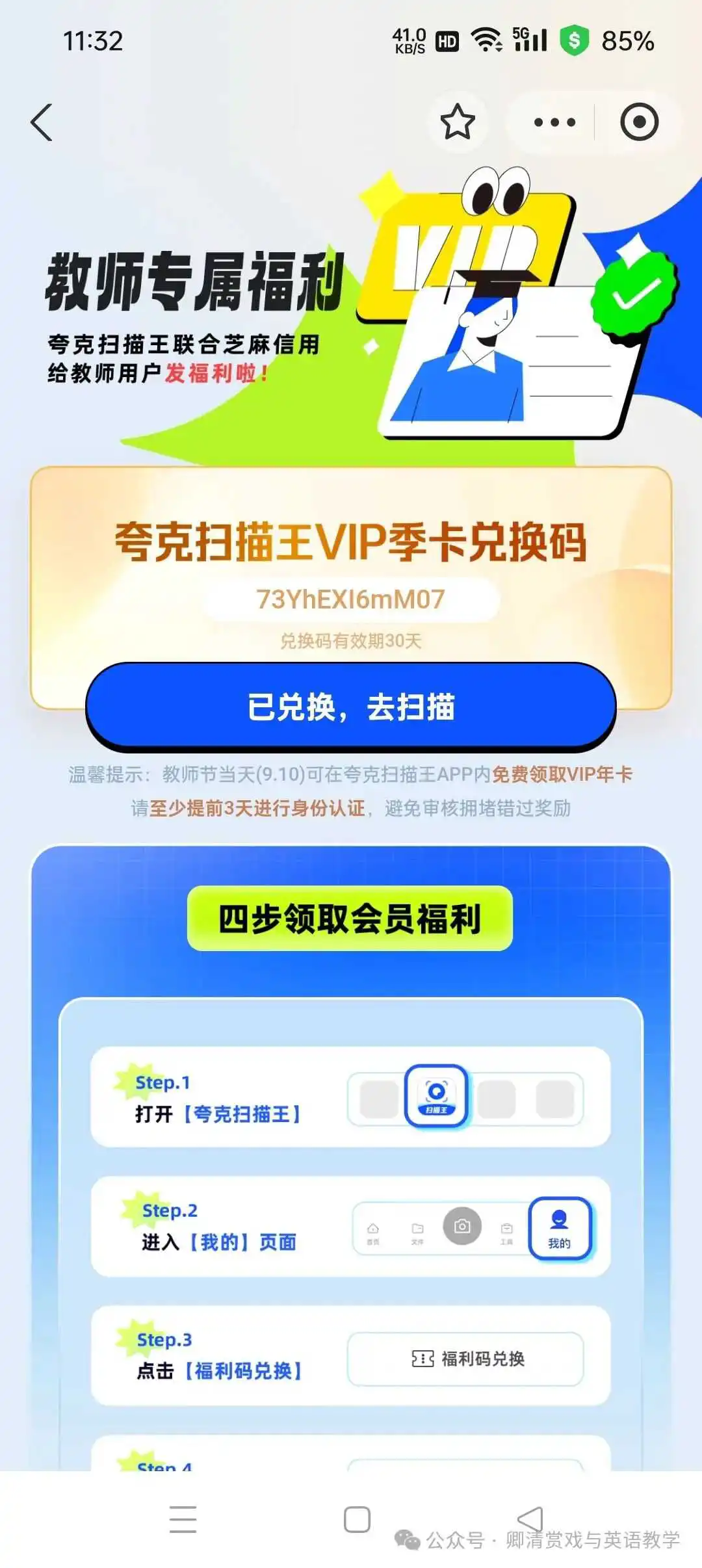 支付宝,认证教师资格后,搜索🔍教师节,领取夸克扫描王VIP季卡等,到2024.12.6