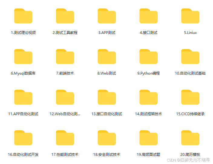 这些资料,对于【软件测试】的朋友来说应该是最全面最完整的备战仓库,这个仓库也陪伴上万个测试工程师们走过最艰难的路程,希望也能帮助到你!有需要的小伙伴可以点击下方小卡片领取