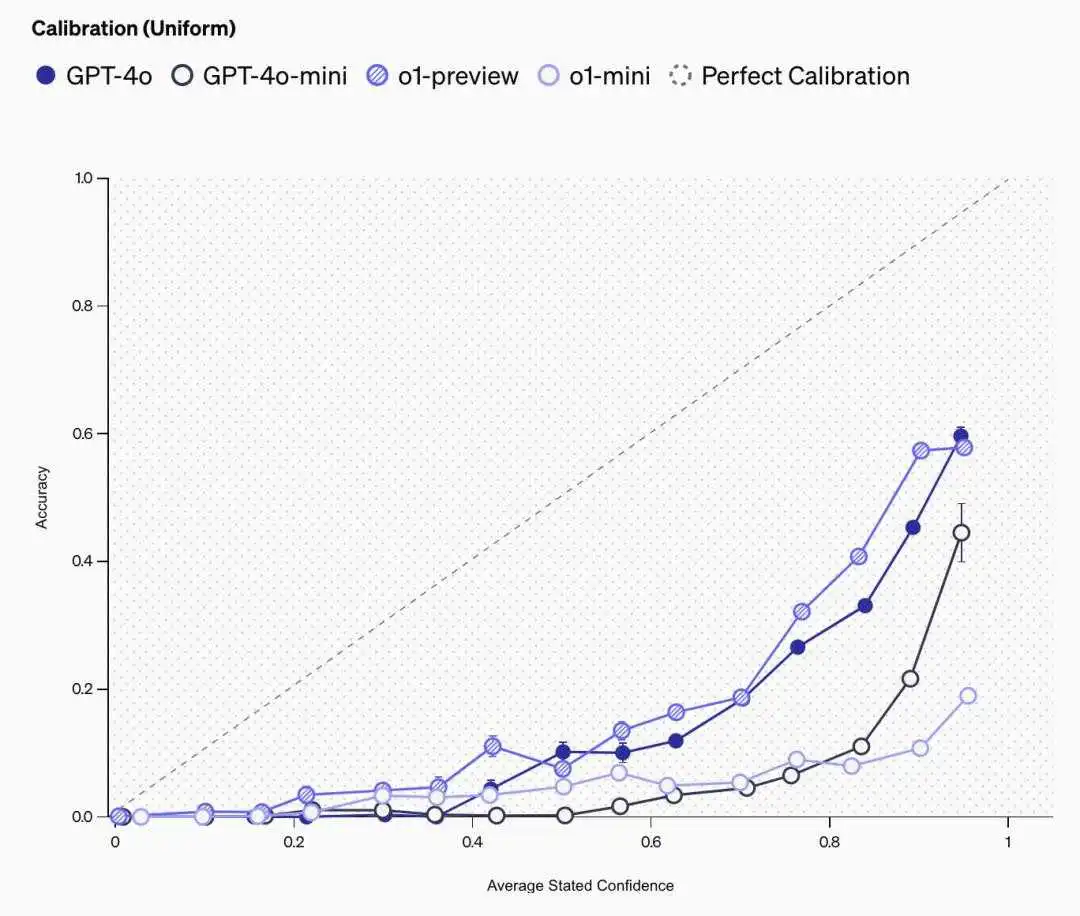 像 SimpleQA 这样的事实性基准,也可以被用来测量名为校准(calibration)的科学现象,或者说语言模型是否“知道它们知道什么”。测量校准的一种方法是,使用提示语直接要求语言模型说明其对答案的信心:“请给出你的最佳猜测,以及你对正确答案的信心百分比”。然后,他们就可以绘制出模型所述置信度与模型实际准确度之间的相关性。一个经过完美校准的模型,其实际准确度将与所述置信度相同。例如,在模型置信度为 75% 的所有提示中,完美校准模型的准确度将为 75%。