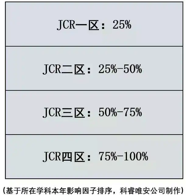 JCR分为Q1、Q2、Q3、Q4,以每25%为界限,呈现“矩形结构”分布。影响因子排名前25%的期刊为一区,前26%-50%的期刊为二区,前51%-75%为三区,后25%为四区。