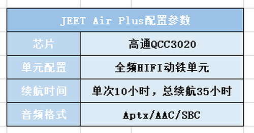 硬件水准方面,JEET Air Plus为了做到良好的产品体验,很舍得下血本,采用高通芯片+全频动铁单元这一高级组合,高通芯片能将蓝牙传输更加稳定,动铁发声单元能带来解析力度更高的音质还原度。并且耳机的续航也十分给力,是同价位中第一款拥有35小时总续航的蓝牙耳机。(如下图)