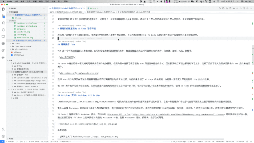选择 Vim 操作的原因在于减少因需要调整内容而打断我写作时的专注过程,当然如果习惯了 VS Code 的快捷键,也能够一定程度上帮助达到和 Vim 类似的效果。