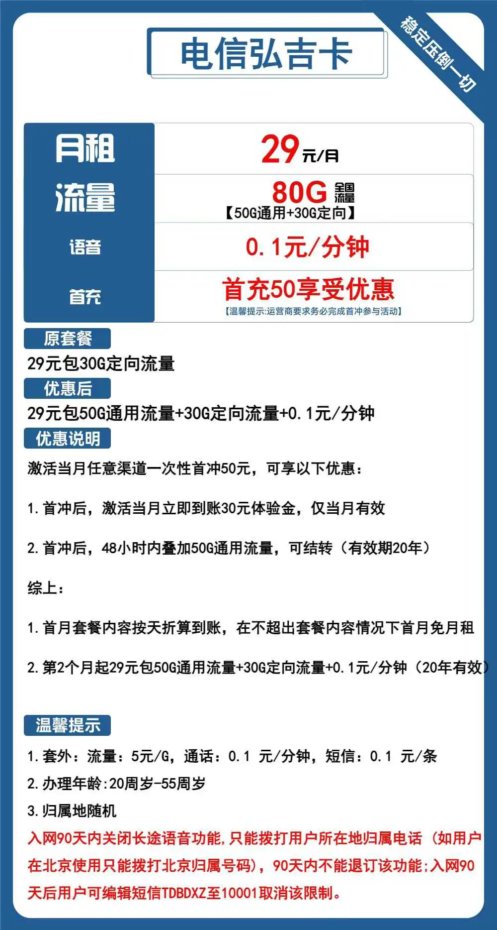 对于需要长期使用流量卡的用户来说,电信弘吉卡是一个值得考虑的选择。这张卡被戏称为"吉林星卡",提供了长达20年的套餐服务。月租29元,您将获得同样大容量的流量资源,即50G的通用流量和30G的定向流量。