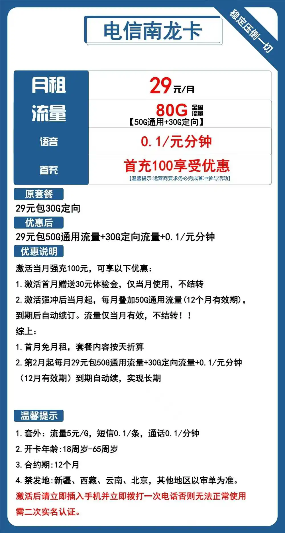 首月免费,随后月租为29元,您将获得50G的通用流量和30G的定向流量,以及0.1元/分钟的通话费用。