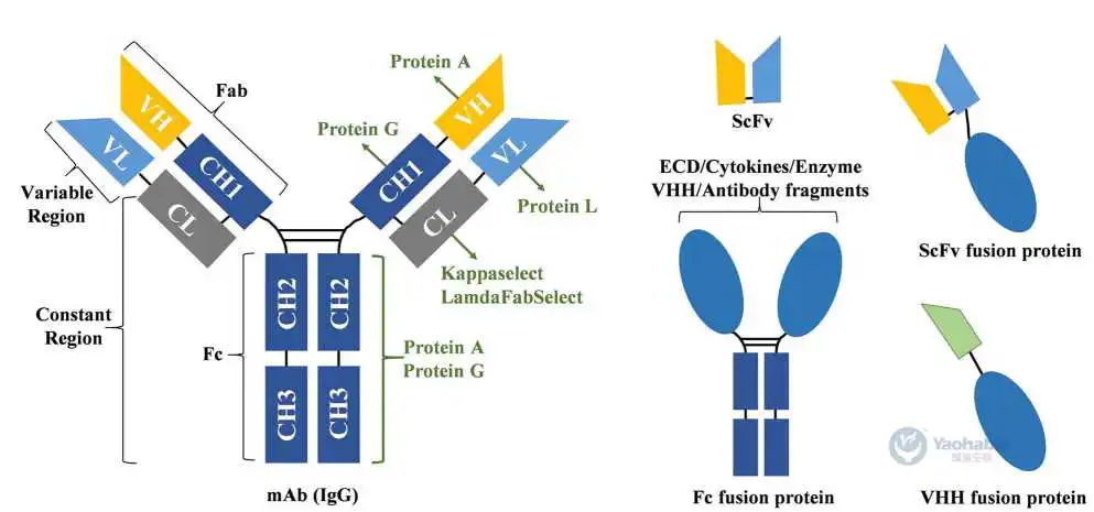 亲和层析(Affinity chromatography, AC)广泛用于单抗的捕获,它依赖于靶抗体与AC填料之间的特异性结合。如图1所示,抗体由不同的结构域组成,不同的结构域可以被设计和生产为具有治疗活性的重组融合蛋白。在抗体工艺开发中,已经开发了Protein A、Protein G和Protein L,用于在不同位点捕获抗体。Fc融合蛋白是最常见的设计结构,通常可以使用Protein A和Protein G层析进行捕获。Protein L和Protein A可以特异性识别ScFv的VL和VH区域以进行选择性捕获。理论上,Protein A、Protein G 和Protein L都可用于捕获Fab片段,它们在应用中表现出截然不同的结合能力。不同的配体结构、配体密度和填料基质导致相同配体类型之间的蛋白质捕获能力存在显著差异,各种填料可能对不同的分子表现出不同的特异性。