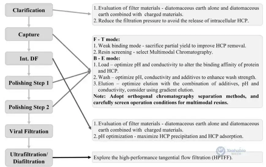宿主细胞蛋白(Host Cell Proteins, HCP)是活细胞分泌的蛋白质、细胞死亡和裂解时释放的细胞内蛋白质异质混合物。在与工艺相关的所有杂质中,HCP通常特别值得关注,因为它们会影响产品的安全性、有效性和稳定性。图4推荐了在下游加工的不同阶段去除HCP的有效策略。