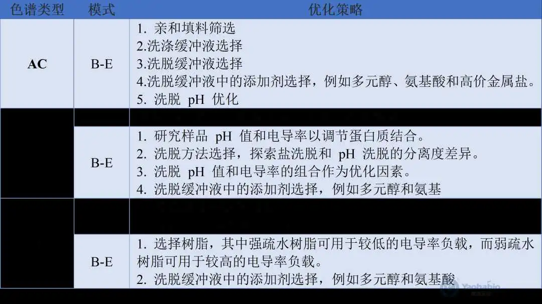 蛋白质聚集是蛋白质纯化中最具挑战性的方面之一。部分聚体来源于细胞培养过程。后期聚集则主要取决于缓冲液条件,需要根据目标蛋白质和聚体之间的物理和化学性质的变化,使用不同的色谱模式来去除聚体。表3总结了在纯化过程中去除蛋白质聚体的方法和优化策略[4]。