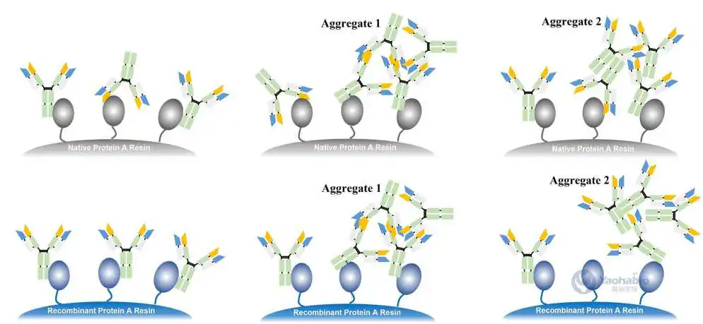 亲和层析。单体和聚体都可以被亲和填料捕获。亲和力的差异会对聚体产生不同的分离效果,因为Protein A可以同时结合抗体的Fc和Fab区域,而结合亲和力取决于填料和抗体的设计。Protein A和抗体之间的亲和力取决于两者的结构。Protein A与Fab区的相互作用较弱,与Fc区的结合较强。相比之下,Protein A缺乏与Fab的相互作用。在洗涤和洗脱缓冲液中添加氯化钙/聚乙二醇(Polyethylene glycol, PEG)或氯化钠/PEG组合可以有效增强聚体和靶抗体的分离。