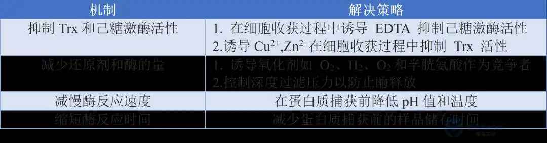 蛋白质包含多个二硫键,二硫键的正确配对对于蛋白质结构和活性至关重要。理想情况下,二硫键在蛋白质分泌到细胞外环境之前是正确配对的,但在细胞培养的复杂氧化还原环境中,二硫键很容易断裂。在生物体中,硫氧还蛋白催化硫醇和二硫化物交换形成二硫键的氧化和还原。此外,由于细胞裂解,细胞内酶、蛋白质和辅因子释放到细胞培养基中会导致二硫键减少。抑制还原酶的活性是解决抗体减少问题的有效方法。结果表明,连续通气、添加硫酸铜和半胱胺可有效抑制分子断裂。此外,还可以通过调节pH值和温度来降低硫氧还蛋白催化反应性,以及实施快速纯化以缩短催化反应时间。如表1所示,为下游纯化中抗体减少的机制与常见策略[1]。