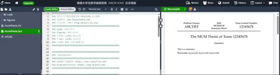 LaTeX可以通过代码控制内容的排版,通过对代码的复制粘贴可以精准高效地保持排版格式的一致性。同时,LaTeX的代码具有良好的可移植性,可以在不同的操作系统和环境下保持一致的排版效果。下图为使用Overleaf排版的美国大学生数学竞赛(MCM)论文模板。
