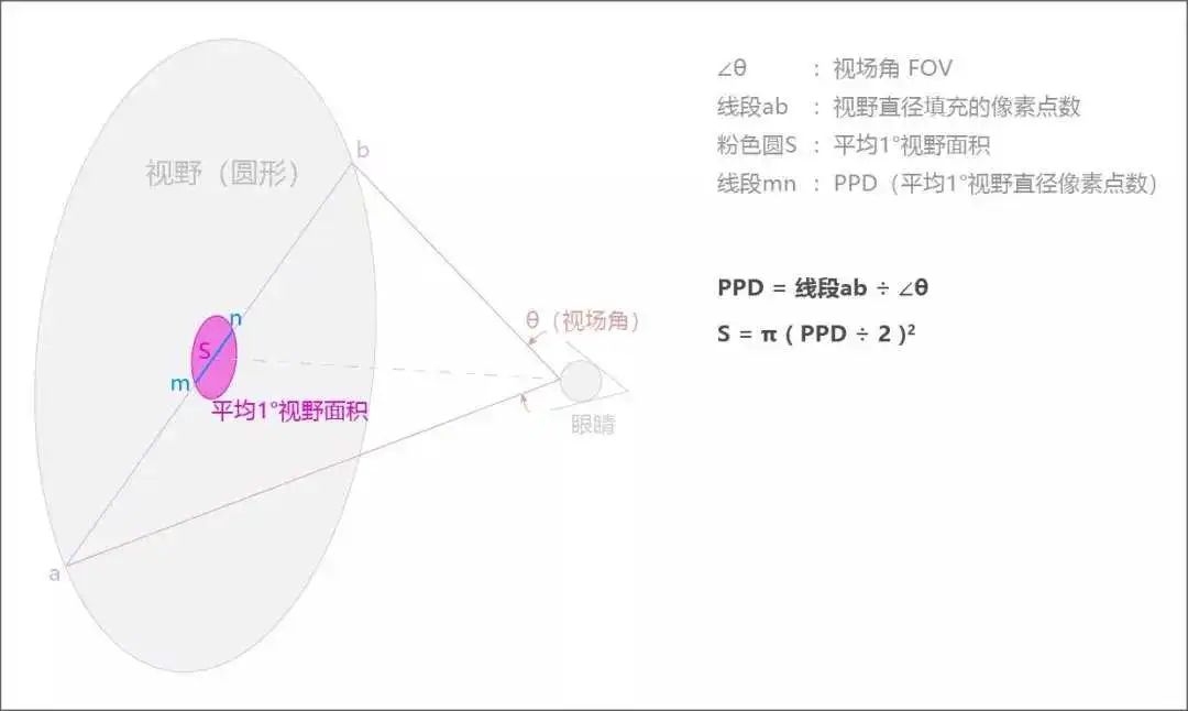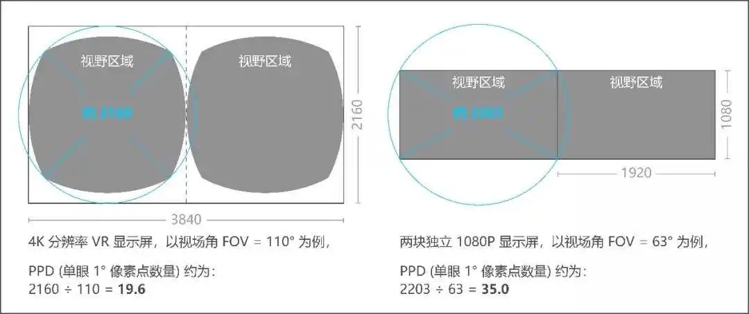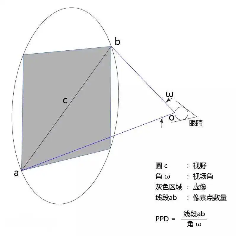 PPD = 单眼成像外接圆的直径像素点数量 ÷单眼成像的对角线的视场角 FOV。