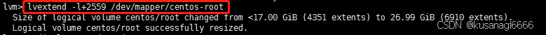 lvextend -l+2559 /dev/mapper/centos-root :扩展容量到此分区中