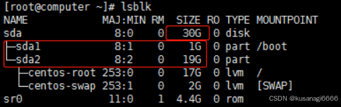 查看到sda1和sda2只有20G空间,但sda有30G,还剩余10G空间没有分配出去