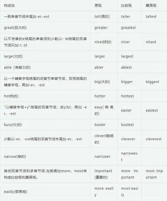 大多数形容词(性质形容词)和副词有比较级和最高级的变化,即原级、比较级和最高级,用来表示事物的等级差别。原级即形容词的原形,比较级和最高级有规则变化和不规则变化两种。
