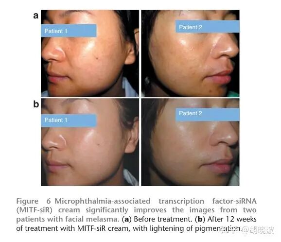 比如2011年的时候,已经有科学家用siRNA的手段来治疗黄褐斑了,它针对的是黑色素的最关键因子MITF,没有它的话,酪氨酸酶都没法产生,你说是不是最核心?