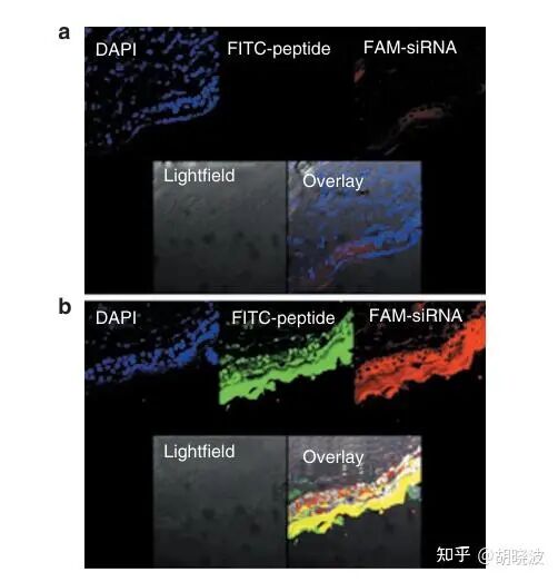 不过问题在于,RNA都很不稳定,而且分子量不小,直接用的话很困难,因此作者还搞了个透皮多肽连接上siRNA,然后在老鼠体内测试透皮效果。